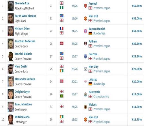 德轉(zhuǎn)統(tǒng)計水晶宮隊史出售球員身價TOP10: